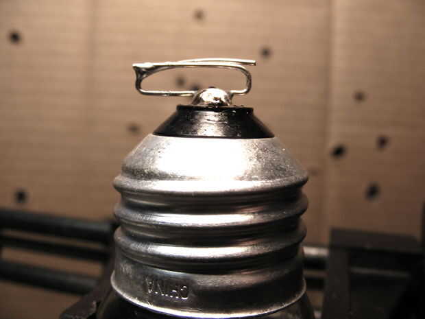 La única modificación necesaria a la bombilla de 25 vatios suelda un asa de alambre en el extremo de enchufe. Hay ya la soldadura en ese lugar, pero un pequeño lápiz tipo soldadura de hierro no proporciona suficiente calor debido la la gran masa térmica del encaje chupando calor, así que utilicé una vieja pistola de soldar.