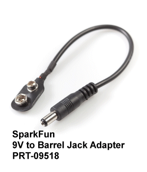 Para llegar a la Arduino un 5.5x2.1mm, cañón centro positivo jack es necesario. Este puede obtenerse de SparkFun como 9V adaptador de Jack de barril PRT-09518.