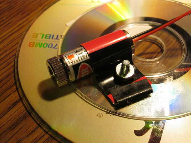 OK, aquí es mi láser funky. (Ver imagen) Tomé una tira de aluminio de un signo de 'En venta' de aluminio y había doblada alrededor de mi láser en una especie de forma de 'P'. Perforé un orificio de 9/64" en el soporte de modo que cuando se utilizan un 6-32 tornillo y tuerca se pinza hacia abajo en la caja del láser. Taladré un agujero de 9/64" en el mini-CD para que sea sobre el láser a través del centro del CD. También utilicé una herramienta rotatoria (Dremel clon) para abrir el orificio de montaje. Luego, utilizando un tornillo de cabeza plana corta por debajo del mini-CD, os adjunto el láser.