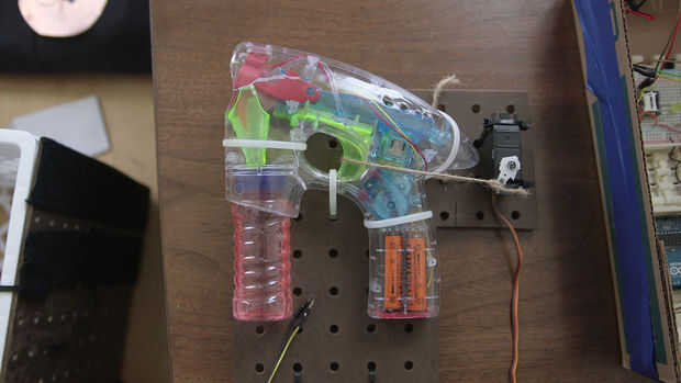 El servo tira una guita que a su vez tira un disparo en el arma de la burbuja. Muy efectivo porque el VarSpeedLibrary nos ayuda a controlar la velocidad para que las burbujas se disparan hacia fuera perfectamente.