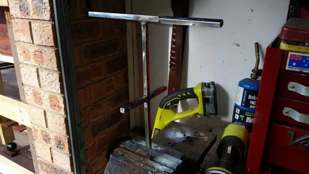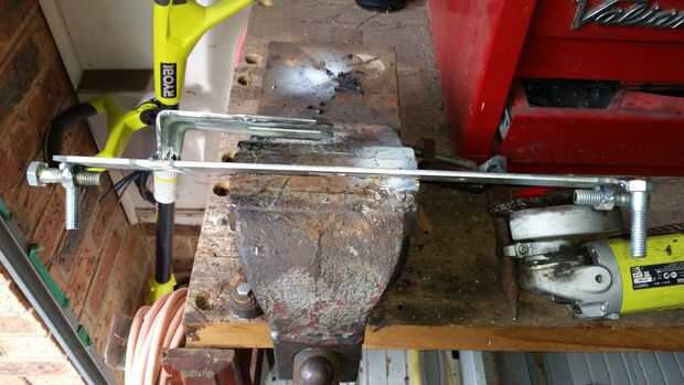 mi olla es de Kmart y es alrededor de 300mm de diámetro así que corte un trozo de eje aproximadamente 280 largo. y el corte fuera en el centro con mi soldador del palillo y barras de acero inoxidable. Tuve que comprar un piso bar para sentarse en la parte superior de mi maceta. sobresale 20mm por cada lado, soldar las tuercas en cada extremo para fijar la placa a la olla, luego soldado con autógena dos pernos estrecho de los extremos en las esquinas opuestas, estos pernos se sientan en las asas de la olla y pararlo frente spinning. Taladré un agujero en el centro de la placa para el eje recorrer.