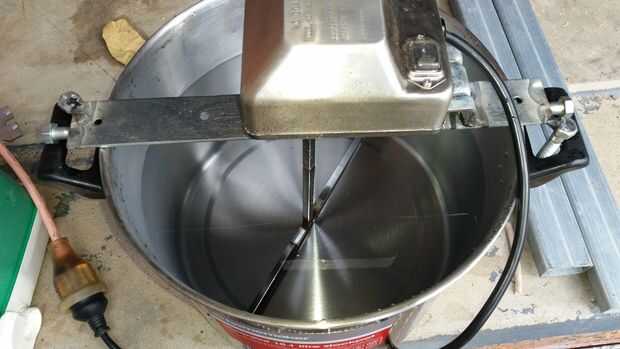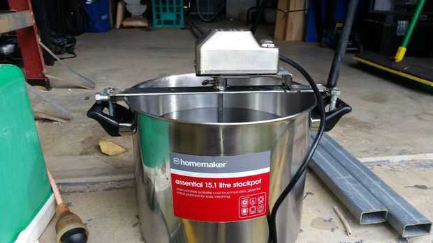 Estoy mirando de hacer algunos alcohol de maíz basado. e implica un montón de agitación o de lo contrario se quemará. así que esta es mi solución automática. Tengo un motor de asador eléctrico barato de mi barbacoa. y cuando lo trajo que el eje fue dos veces como lo necesitaba había puesto aparte para un proyecto de futuro.