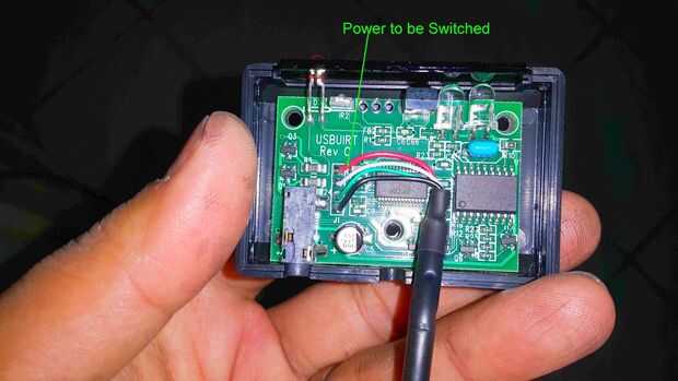 Básicamente quité el cable de alimentación de 5 voltios de la placa de circuito UIRT y sustituir un cable separado para la alimentación de 5 voltios. El nuevo cable tendrá su poder ciclo OFF a través de un contacto del relé normalmente cerrado.