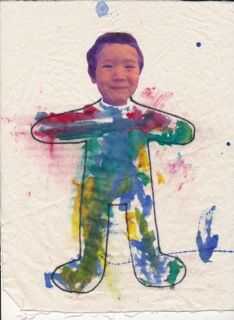 Con mis 3 años de edad, usar una transferencia de fotos en tela y pintar su propia sección de una colcha de la amistad.