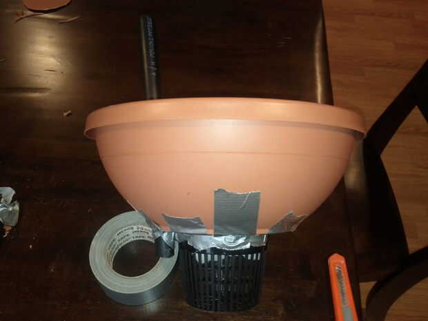 Inserte su red pot y tubería y cinta para evitar el desplazamiento de las piezas. Tubo debe ir sólo a través de la taza ligeramente.