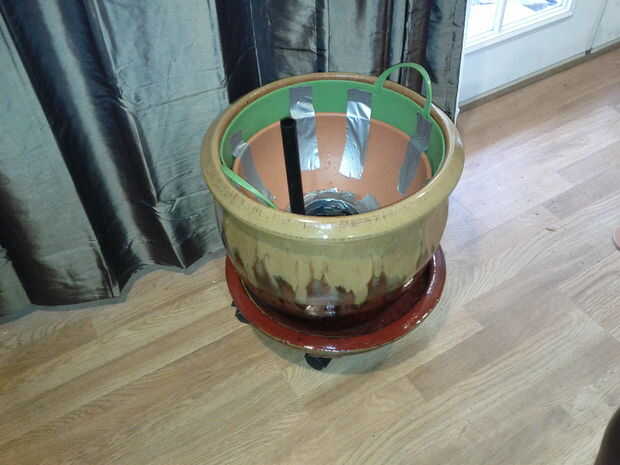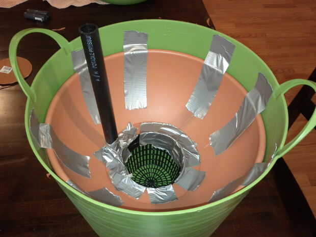 La bañera se establece en la olla grande y con su tapa por debajo del borde. Dejé las manijas, como hacen conveniente si desea llevar la bañera fuera para rellenar con tierra, etc. y debe quedar oculto por las plantas de todos modos.