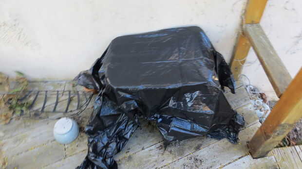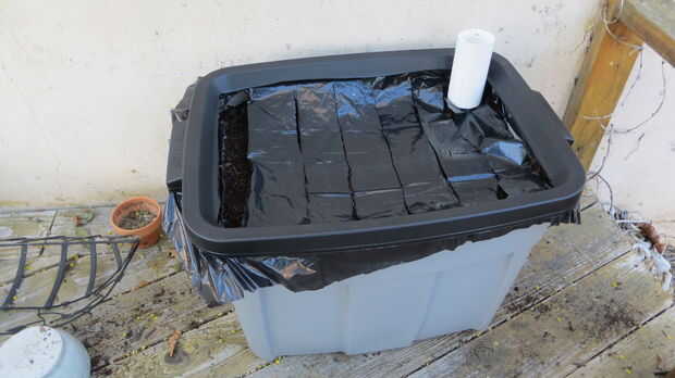 Finalmente, cubrir todo con un trashbag negro. Cortar un agujero para el tubo respirador, deslice la bolsa hacia abajo, complemento en la tapa anterior y recortar la bolsa sobrante.
