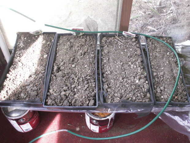 Los estantes plástico taladré un agujero en, y en la parte inferior están relacionados con un tubo de drenaje, en un cubo más pequeño.