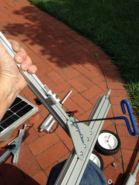 El primer paso es montar el mástil con la base. El mástil es de 36" a extrusión de ranura en T de 1" x 1". La base es de 24" a extrusión de ranura en T de 1" x 2". Están conectados junto con un 5 agujero soporte, también fabricado por 80/20.