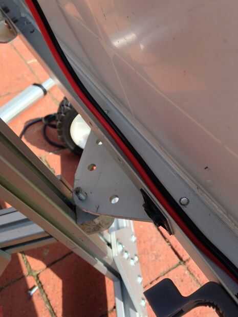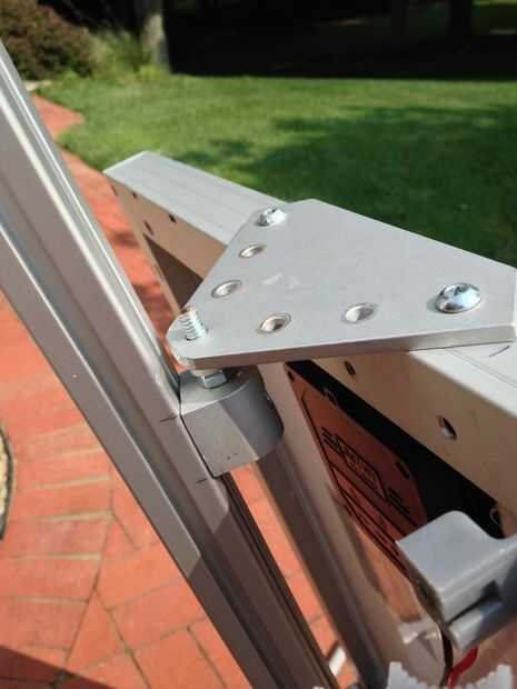 Tome los pedazos de 90 grados restantes (2) e instalarlos en el mástil como se muestra. Estos deben espaciados para que coincida con la distancia entre los dos soportes. En este punto tienes dos opciones, usted puede insertar uno de los tornillos de cabeza hexagonal de 1/4-20 en el soporte de panel solar y en el quid. Puede hacer esto por la parte superior e inferior. La alternativa es hilo de rosca 2 secciones pequeñas de tornillo 1/4-20, cerca de 1.5" de largo con tuerca de fijación de un espaciador de plástico en el quid. Esto le permite deslizar el panel de encendido y apagado fácilmente.