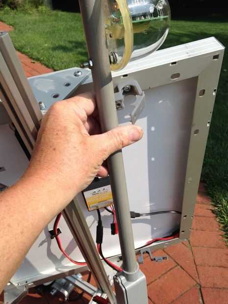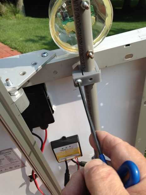 El sensor se monta en el extremo de la tubería CPVC de 1/2". El sensor tiene (4) cables, positivo de la batería, la batería menos, CW y CCW para el actuador. La caja pequeña se monta hasta el CPVC 3/4 y otro tramo corto del CPVC se extienden la parte inferior de la caja, lo suficiente para llegar a la parte inferior del marco exterior del panel solar. Este conjunto se fija al panel solar utilizando abrazaderas. Los cables se accede desde la parte inferior y salen por el lado al controlador y a la parte superior en el sensor.