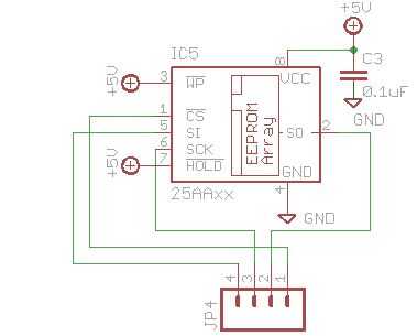 C3 (0.1uF) desempareja la EEPROM SPI desde la fuente de alimentación. La escritura (WP) de proteger y sostener pernos pueden ser controlados por un microcontrolador, pero nosotros los discapacitados mediante la celebración de estos pines alta. Los pines del bus SPI, CS,, CLK y DI, son llevados al header JP4.