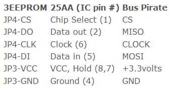Si está utilizando a un Bus Pirate, conecte al 3EEPROM o 25AA-IC como se muestra en la imagen de la tabla a continuación. SPI normalmente no requiere de resistencias pull-up.