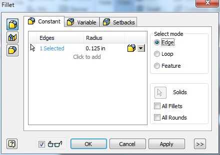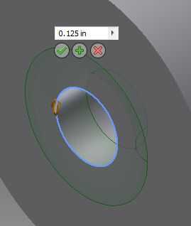 1. Haga clic en la herramienta de "Filete" . 2. Haga clic en el anillo del círculo pequeño. 3. Introduzca "0.125 en" si tu número es diferente. 4. Haga clic en "Aceptar"