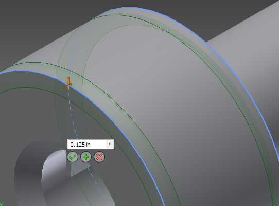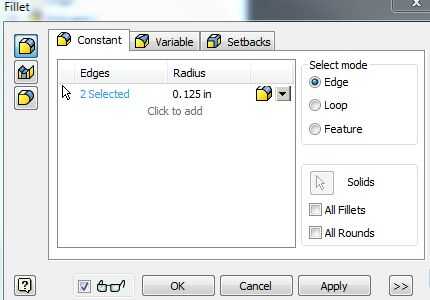 1. Seleccione la herramienta de filete. 2. Haga clic en los dos bordes como se muestra en el cuadro 1. 3. filete les de "0.125" en radio. 4. golpear "OK"