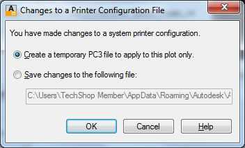 Al salir de estas capas de cuadros de diálogo que se le ofrecerá este pequeño cuadro preguntando si desea guardar los cambios en un archivo de configuración temporal. La respuesta a esta pregunta es "Aceptar". Si haces este trabajo muchísimo, se puede ahorrar algún tiempo hacer los cambios a un archivo PC3 que mantienes con tu proyecto en lugar de crear un archivo temporal cada vez.