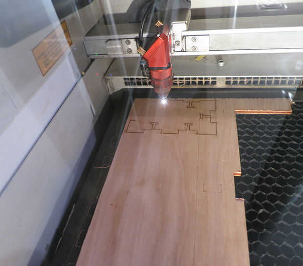Si todo ha ido bien, el láser se encenderá. Puede parecer que el láser corta una línea delgada que sólo es dibujar en la superficie del material y no corte a través de todo el camino, pero al levantar el material tras el corte, las partes deben caer hacia fuera. El real corte de láser de Trotec en madera contrachapada gruesa de ¼" es sólo unos 0,00748" pulgadas.