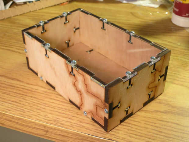 En este diseño que he optado por usar #4 tuercas y tornillos ya que la dimensión del plano a plano de una tuerca #4 es exactamente ¼", que es el espesor de la madera contrachapada. #4 tuercas les permitan poner el plano dentro y fuera de la caja. También he elegido para el diseño de la caja alrededor de mi longitudes de perno por lo que puedo en cada tuerca del hilo de rosca, pero no se extiende a través de al otro lado de la tuerca.