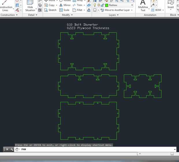 Lo que finalmente decidí hacer fue dibujar las cajas yo en AutoCAD para la salida de láser de Trotec de TechShop. TechShop tiene un convenio con Autodesk para proporcionar toda su última CAD y software de modelado en todos equipos de TechShop, así que sabía que tendría las herramientas de software que necesitaba para trabajar con.