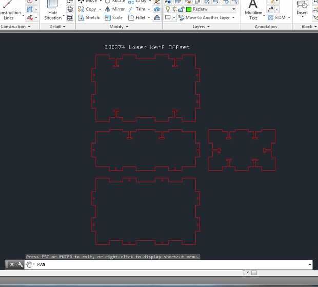 El siguiente paso en este proceso fue para determinar la cantidad de material que el láser quema lejos cuando corta una parte. En carpintería, la anchura del material que se pierde para serrín se llama el corte. Con la experimentación, que encontré el desplazamiento necesario para láser de Trotec de TechShop es cerca de 0,00374"(la mitad del corte) al cortar ¼" madera contrachapada. También encontré que el corte del laser era menor cuando cortar Pino ¼" o corte de Lucite. Me imagino que este corte sería diferente en diferentes marcas de láser Trotec. Aquí buscar una copia de mi caja con todo el desplazamiento de los bordes de esta dimensión. En AutoCAD había hecho una polilínea de cada lado de la caja había utilizado el comando Offset con una dimensión de 0,00374" y borra las líneas originales.