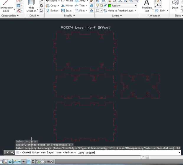 Desde la función predeterminada de AutoCAD es para establecer características de la línea de las líneas de capa, entonces utilicé el comando Change para establecer las propiedades de todos los elementos de mi caja a mi capa cero peso.