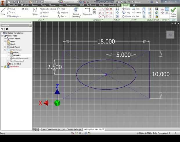 Seleccione crea dibujo 2D. Cuando se le pida que seleccione una cara plana Seleccione el plano XZ como su referencia y arrastre el nuevo plano de él. La dimensión necesaria para el desplazamiento paralelo es 8" y en la dirección de Y positiva. Una vez han entrada 8" dimensión para entrar en el golpe de offset. Usted se tendrán automáticamente en un dibujo nuevo. Creación de la geometría como se muestra en la figura. Elipse el comando se encuentra en la pestaña "Dibujar" al lado de "Spline" y se requiere una dimensión vertical y horizontal para ser totalmente restringido en esta situación. Para acotar la elipse simplemente habilitar el comando de dimensión, seleccione la elipse y moverse ya sea por encima por debajo o al lado de la geometría para determinar el tipo de cota a. Una vez completado bosquejo final.