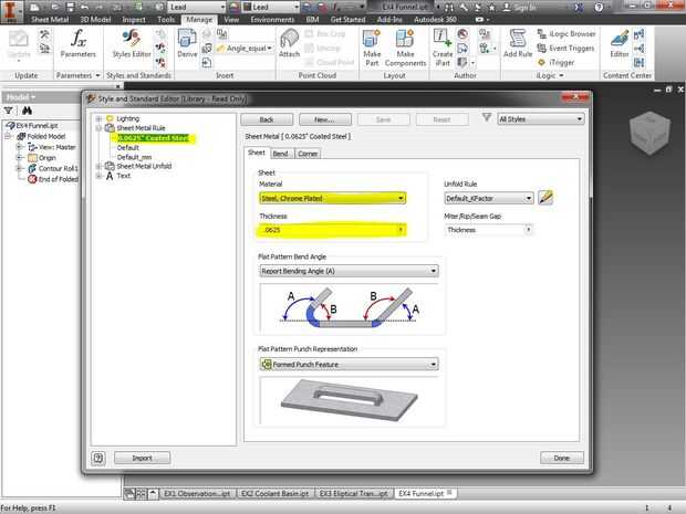 Por favor cambia el Material y espesor , como se ve en la figura. Doble una vez completado haga clic en 0,0625" acero revestido desde el navegador en el lado izquierdo bajo la Regla de Metal de hoja. Esto hará que la regla para el archivo actual, usted puede verificar esto ha sucedido por observando 0,0625" revestido acero cambio demasiado texto en negrilla . Una vez finalizado seleccione hecho en la esquina inferior izquierda. Seleccione la ficha de hoja de Metal en la esquina superior izquierda de la pantalla para volver a las herramientas de creación de función de chapa porque actualmente están utilizando la ficha administrar .