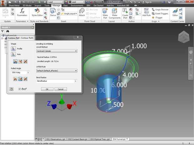 Seleccione Contorno del rodillo de la hoja de Metal ficha Seleccione el perfil 2D más complejo que acaba de crear como su perfil y la vertical la línea que usted ha creado, en el mismo bosquejo, como la ejes. Establecer su Ángulo laminado a 359,9 grados, para permitir el despliegue y seleccione OK para completar la función.