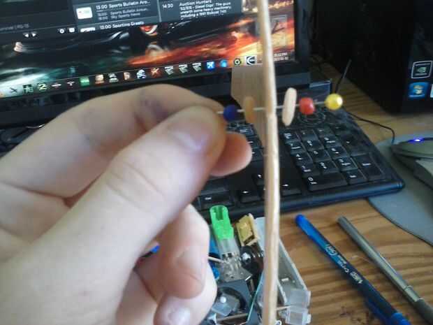 Cortar 2 círculos pequeños de la espuma. Estas ayudarán a reducir la fricción.  Hacer un pequeño agujero en el centro de cada uno. Lugar entonces todas las piezas mencionadas (y 2 granos) en la espiga para crear el cubo del rotor. La orden debe ser como esta: 0-o-O-X-O-o---