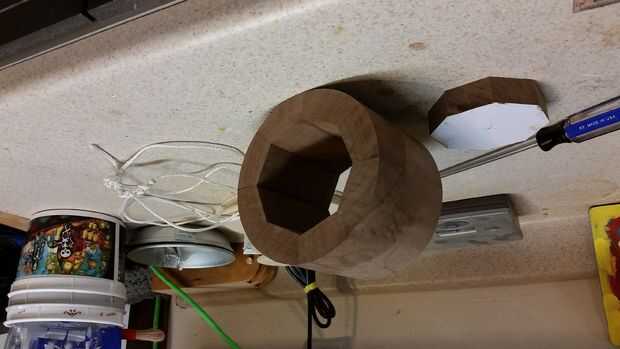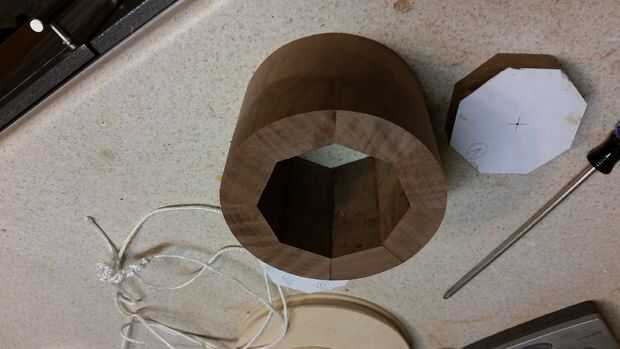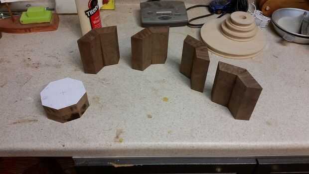 Tuve una buena tabla de lo que fue probablemente nogal. Esto define la longitud máxima del tambor. I establecer el Hanon y 22,5' corte 8 pentagramas de igual longitud, utiliza la lijadora de disco true junto 2 de ellos para arriba y pegado a la vez. Ya que este es un proyecto de baja tensión que no preocuparse de cosas como las uniones difíciles, solo pegar. Una vez que el tubo octogonal, yo apenas había redondeado lo con la lijadora de disco hasta que era sobre todo cilíndrica. Exactitud no es necesario ya que el taladro establecerá cada pin con la misma profundidad en relación con el eje del tambor.