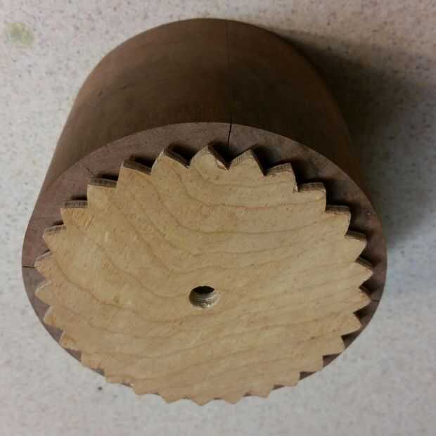 Trazado de los engranajes con http://woodgears.ca/gear_cutting/template.html, luego les impreso y pegado a las planchas de madera barata y corte en la Sierra de cinta. Siempre utilizo madera contrachapada para engranajes, puesto que la dirección alterna de grano proporciona resistencia en múltiples direcciones donde single ply madera es fuerte en todo, pero no con el grano.