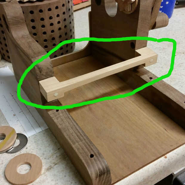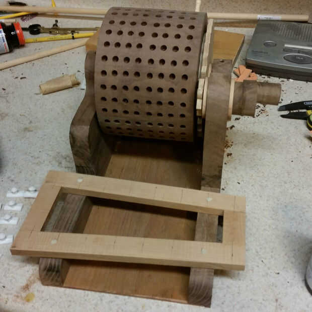 Este material no tenía ningún plan, acaba de hacer para montar el tambor y martillos. Hay una base para apoyar el xilófono, una barra para apoyar los martillos para que sólo lleguen a las notas una vez en lugar de rebote y una manivela para la marcha.