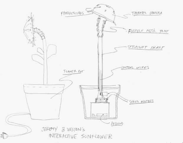Nuestro proyecto es un girasol autónoma. Como en la naturaleza, la más alta prioridad para nuestra flor es luz solar, necesaria para la fotosíntesis. Nuestro girasol Arduino controlado se construye mediante impresión 3D y tecnologías de corte de láser. Principalmente, nuestra flor encuentra y sigue la fuente brillante de luz. Esta flor es diferente de su girasol típico, porque cuando una persona se encuentra lo suficientemente cerca, la flor mueve sus pétalos para reconocer su presencia. Hemos sido capaces de utilizar la aleación de memoria de forma (SMA), en la forma de una aleación de níquel y titanio (Nitinol), para facilitar la apertura y cierre de los pétalos de la flor. Nuestro objetivo era combinar la tecnología con una iniciativa verde para crear una planta verdaderamente interactiva.