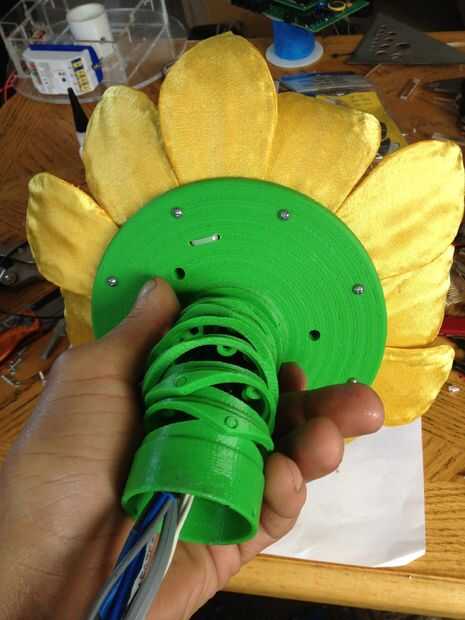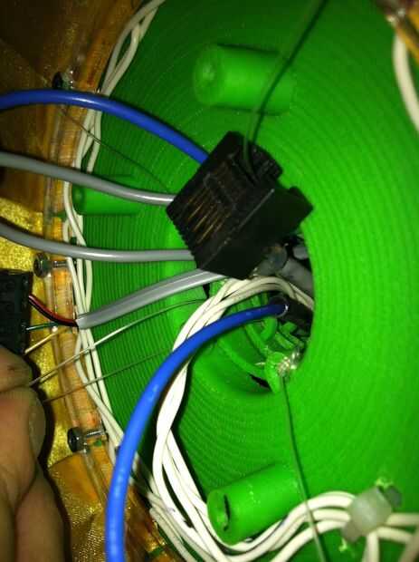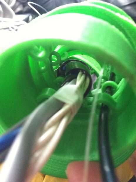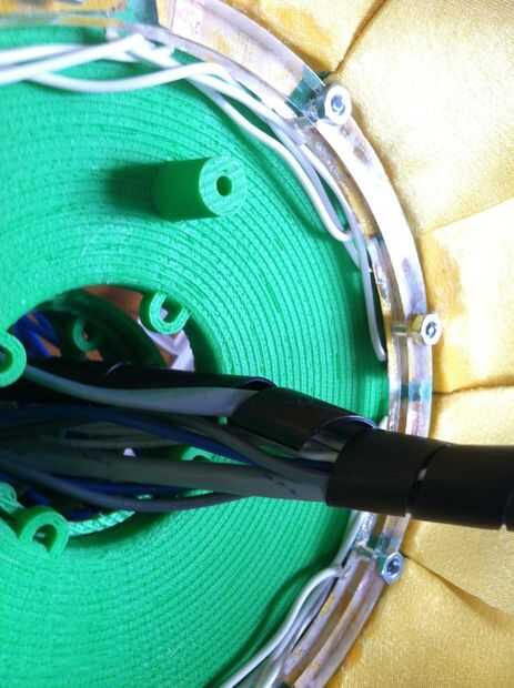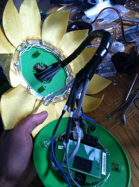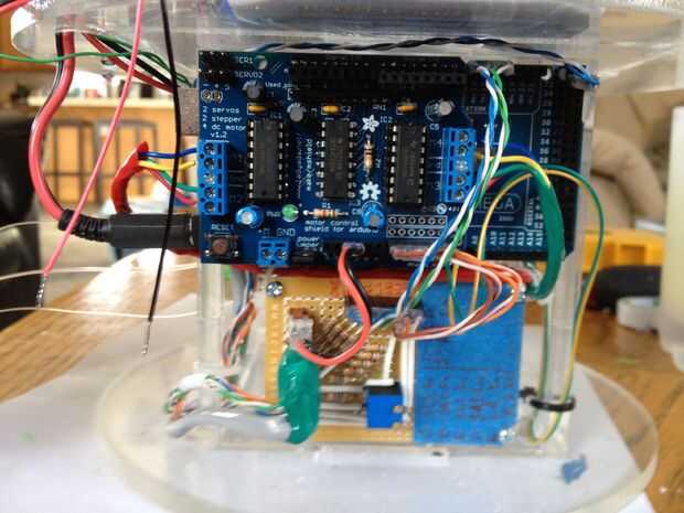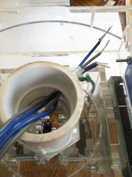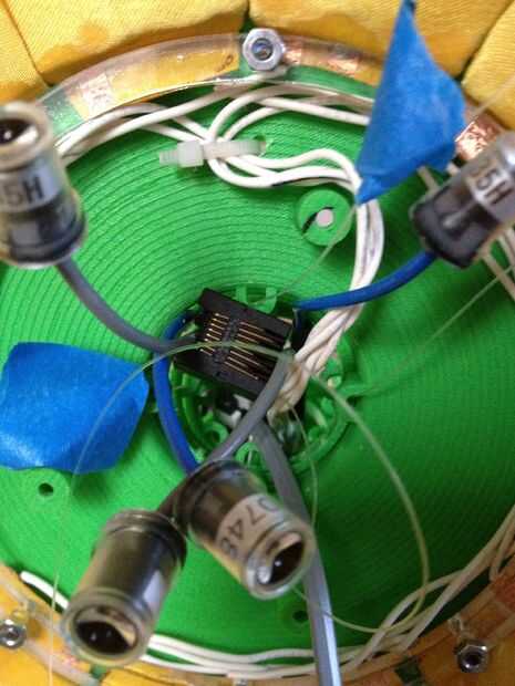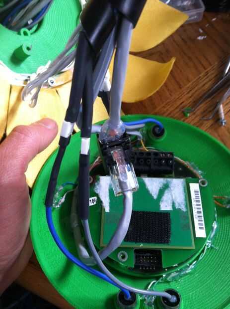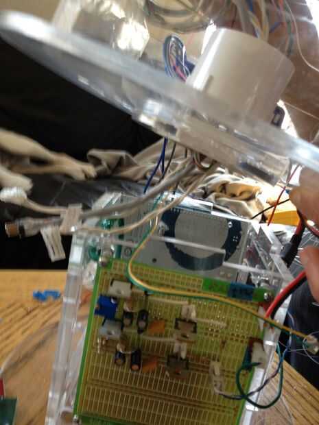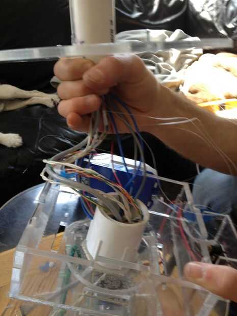 This was the most challenging part of the process.  Tuvimos que pescar el cableado a través del cuello y tallo (a través del conducto), y luego claramente enrutado y había asegurado en la base.  La parte realmente difícil era hacerlo perfectamente encaminamiento de la línea de control de monofilamento a través de la madre y colocar en la cabeza y motores.  Estas series de fotos dan una buena idea del proceso de la Asamblea general.