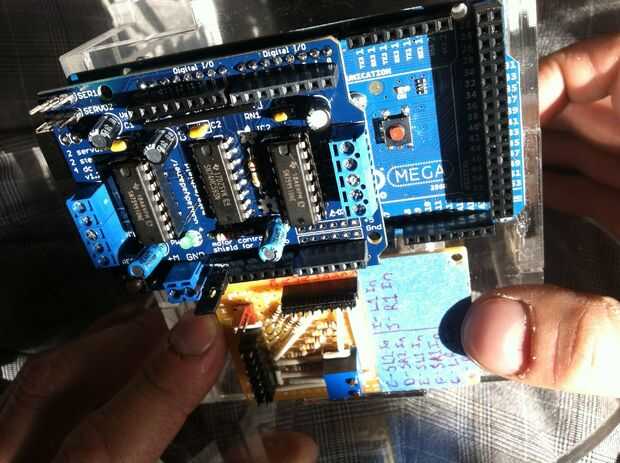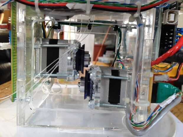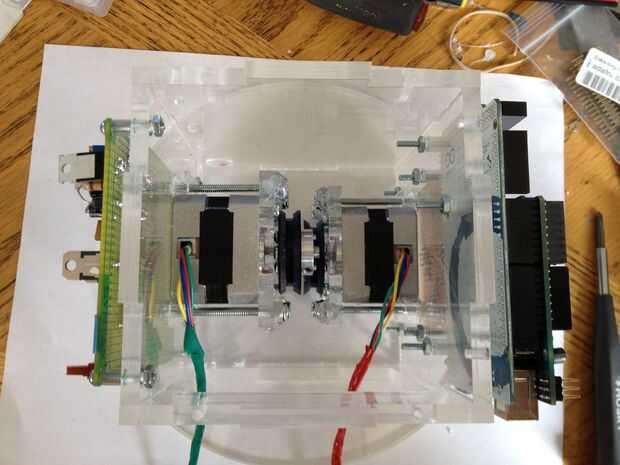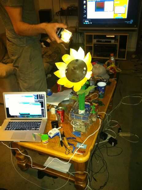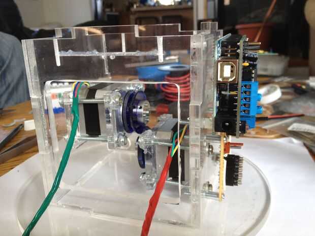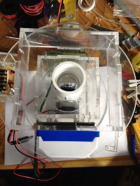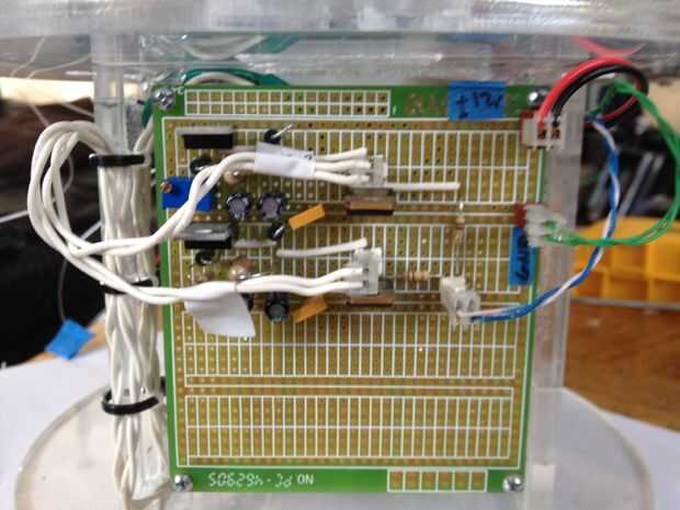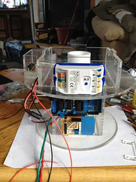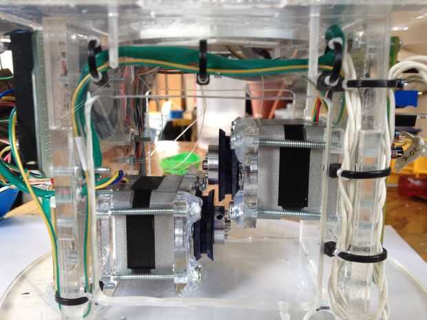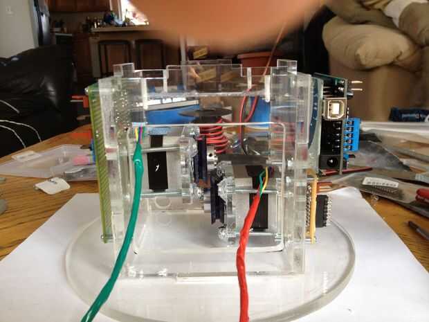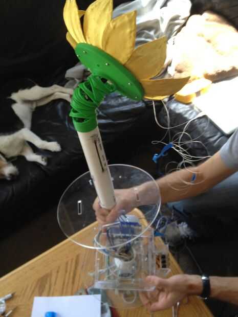 This was the most challenging part of the process.  Tuvimos que pescar el cableado a través del cuello y tallo (a través del conducto), y luego claramente enrutado y había asegurado en la base.  La parte realmente difícil era hacerlo perfectamente encaminamiento de la línea de control de monofilamento a través de la madre y colocar en la cabeza y motores.  Estas series de fotos dan una buena idea del proceso de la Asamblea general.