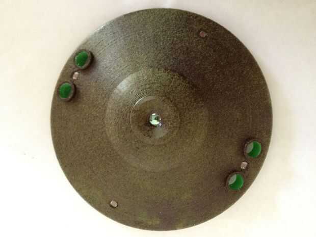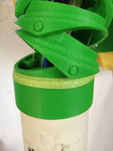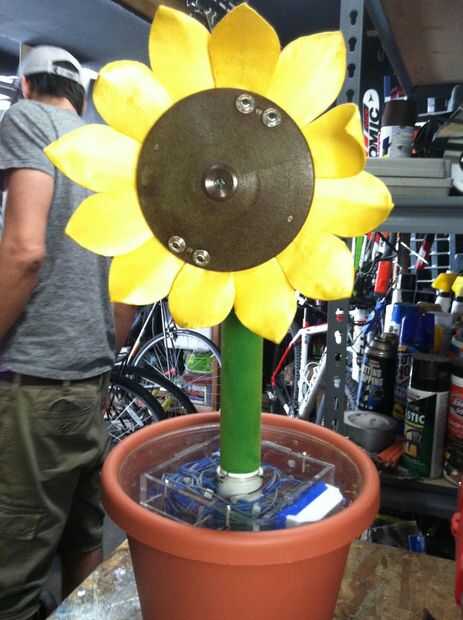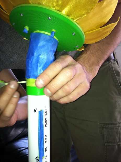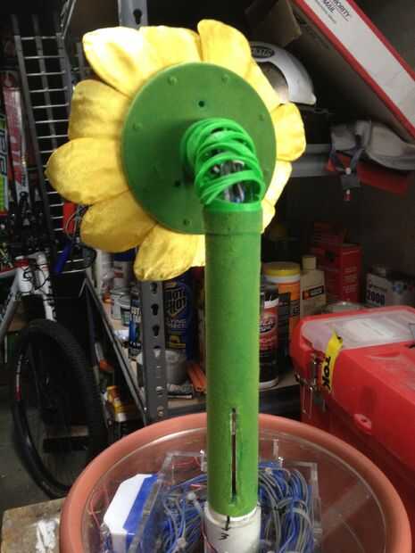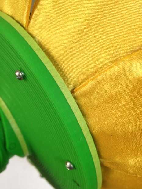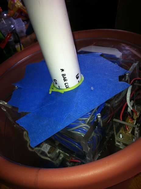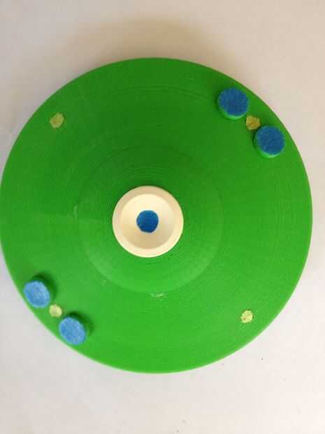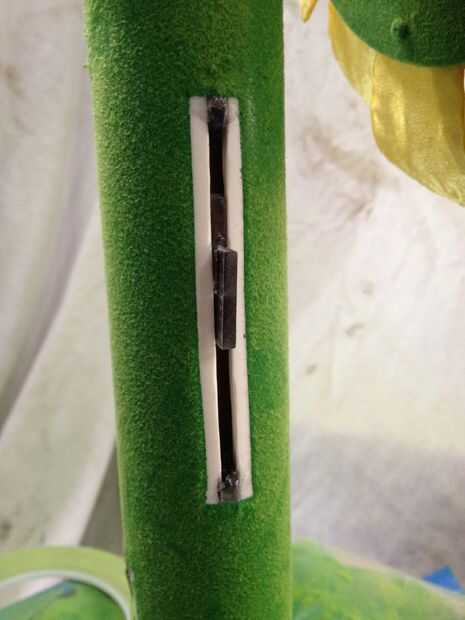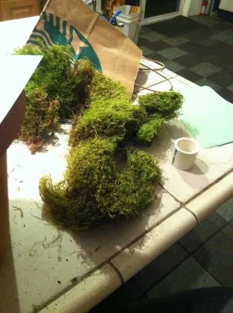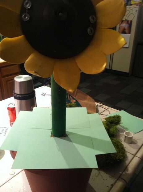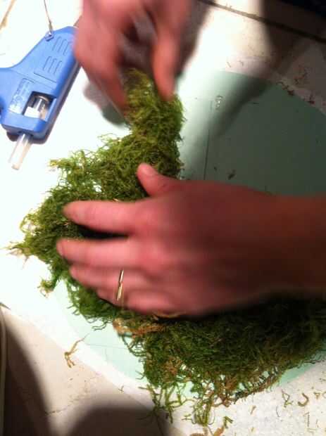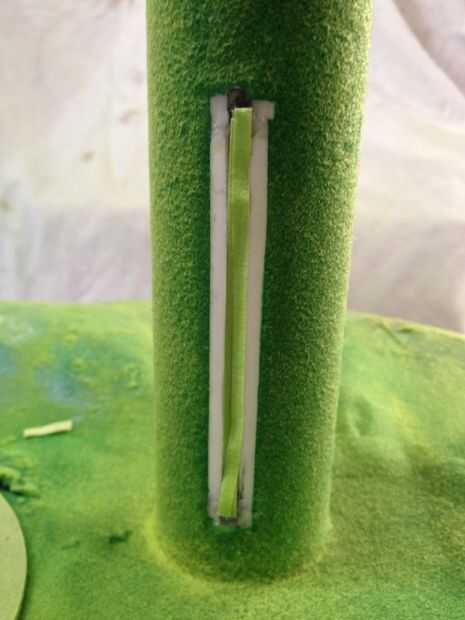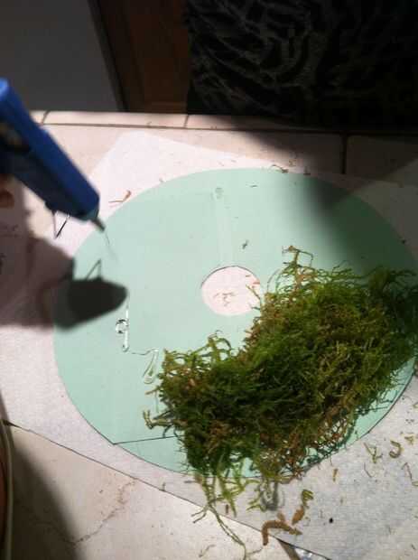 Para hacer la hierba musgo para el pote de flor, cortamos un trozo de papel de cartulina para que se sienta encima del acrílico pase y quede dentro del borde de la maceta. Cortamos un agujero en el medio del tallo y un corte desde el exterior al centro para que podríamos ponérselo y quitárselo. Entonces utilizamos pegamento caliente (caliente o goo, como nos gusta llamarlo) para aplicar el musgo en el papel.