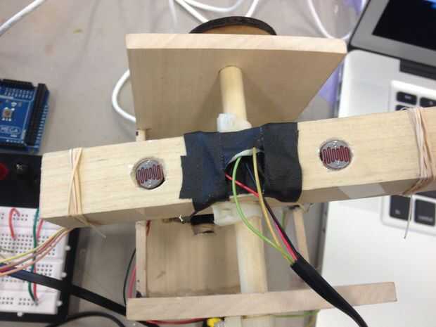 Creación de un prototipo es un paso muy importante en cualquier proyecto. Ya que nuestro principal objetivo de este proyecto fue el hallazgo de girasol y seguir una fuente de luz, nuestro primer prototipo era una luz de eje simple encontrar la máquina. Este prototipo consiste en un balancín como aparato con un fotoresistor en cada extremo de la sede la sierra. Utilizamos un motor paso a paso angular el balancín hacia la fuente brillante de luz. Se trata de un mecanismo sencillo donde el objetivo es conseguir los dos fotorresistores tener el mismo valor. El motor tire el balancín desde el extremo donde el fotorresistor tiene el valor más alto (más luz) y cuando los valores de los sensores están dentro de un rango permisible de cada uno. Para asegurarse de que los motores no continuó tirando más allá del límite del mecanismo del balancín, utilizamos pequeños interruptores momentáneos que llamaremos "final de carrera". Hemos programado el Arduino para que los motores no se convertiría en una dirección dada si había alcanzado el límite.