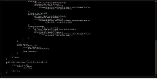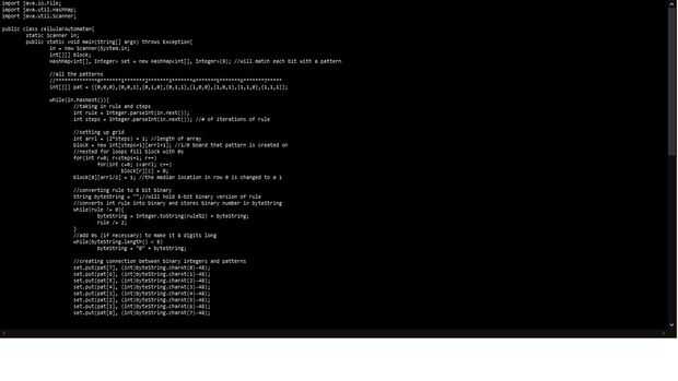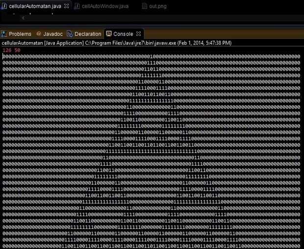 he creado este código de Java para producir patrones 2D de autómatas celulares. Toma una regla número (0-255) y el número de iteración. Por ejemplo, el patrón en la imagen principal fue producido por introducir (126 50). Aquí hay un enlace a un archivo de texto que contiene el código fuente: bit.ly/1lQvlT7 No dude en mejorar!
