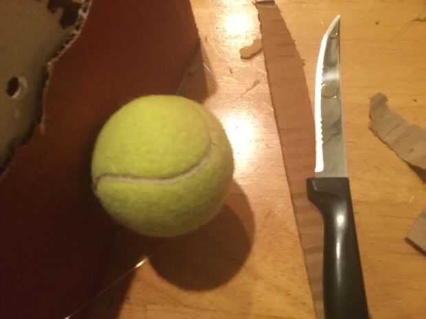 Taladrar un agujero en una pelota de tenis y deslícelo hasta el final de su pasador para hacer una manija. Pegamento para que no se salga.