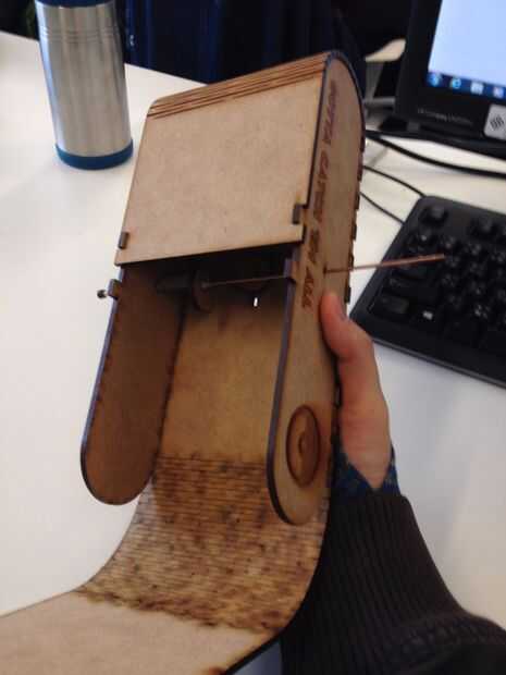 insumos necesarios:madera de 9mmmadera de 3mmMáquina de la molineríaBal de tenisTaladroPegamento calienteCaja de cartónPelota de tenisPasador - por lo menos 3 piesPaso 1: Cortar la madera Cut 2 cams y 2 círculos de su gruesa madera con la fresadora.