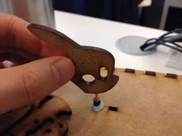 Coloque la cabeza de Pikachu en un extremo de los palillos de dientes. Por separado, pegue las tuercas de madera que ahora son una sola pieza en la parte superior de la caja directamente en la parte superior donde está el agujero en forma de palillo de dientes. Para la colocación correcta, utilice el palillo de dientes para asegurarse de que puede moverse suavemente arriba y abajo a través de las dos ruedas y el hueco del tamaño de un palillo en la caja.