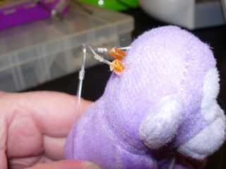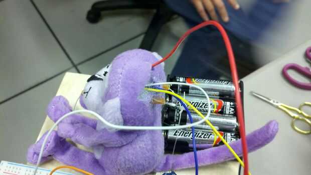 Una tercera línea es conectar los dos primeros detrás de la cabeza de monos. Esta línea se encamina entonces a través de la parte superior de la plataforma donde el mono se sienta y está conectada al servo. Al configurar las mono, plataforma y pueden tener algunos ajustes a realizarse en la longitud de esta tercera línea para obtener el movimiento más realista del mono.