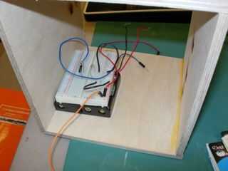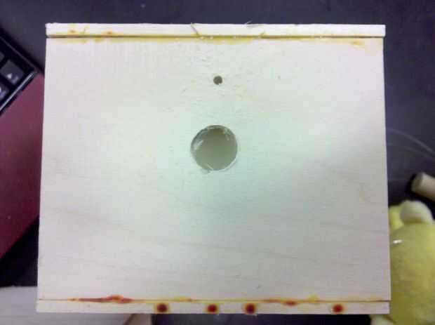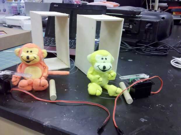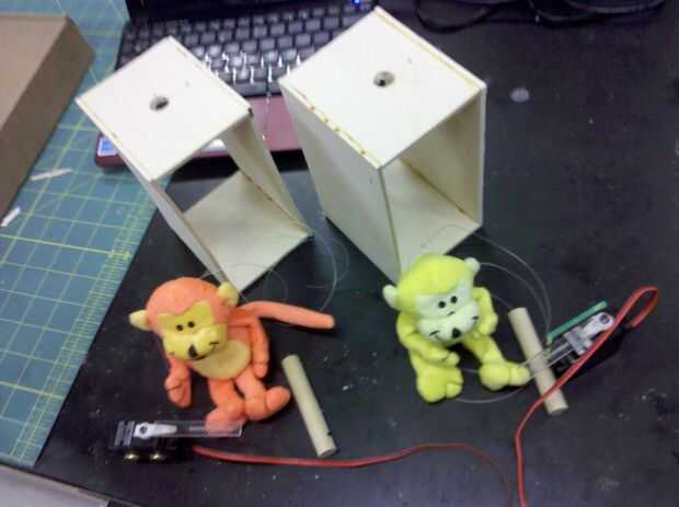En la parte superior de cada plataforma hemos perforado dos agujeros, uno a una clavija que se insertó en el mono para mantenerlo en su lugar y el otro detrás de él para enrutar los cables y línea de pesca a través de la plataforma y el Arduino o el servo.