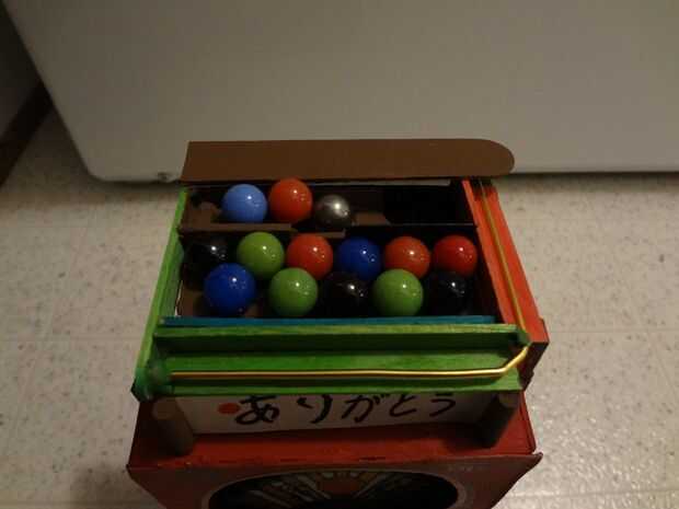 He optado para que las canicas se sientan en la parte superior de la máquina con 3 cargado listo para ir en cualquier dado inserción de níquel. También hizo una placa y había grabado con mi nombre y fecha y unos diseños de pegamento en la parte inferior.