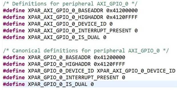 • Otro útil archivo es "xparameters.h" que se encuentra dentro de la carpeta "incluyen" en carpeta "ps7_cortexa9_0" (si ha elegido la primera CPU de la base) o "ps7_cortexa9_1" (si elige segundo núcleo CPU). Este es el archivo de parámetros para nuestro Vivado procesador Zynq. Figura en este paso muestra algunos parámetros útiles de axi_gpio_0.