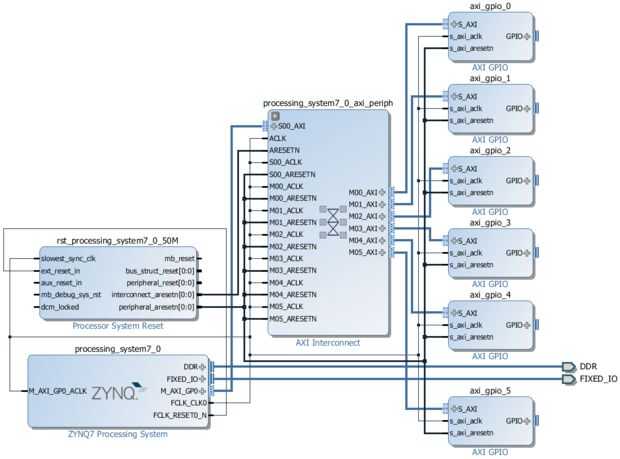 • Repita el paso anterior para agregar seis cuadras "GPIO de AXI" el diagrama de