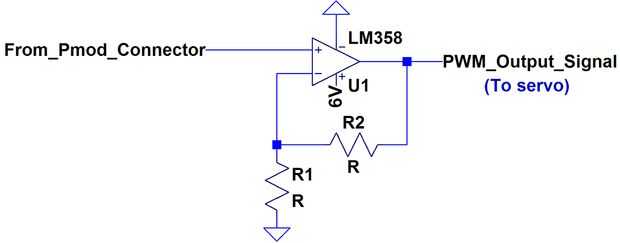 • Una solución simple está construyendo un amplificador sin inversión. Usted puede elegir cualquier amplificador operacional (amp op) puesto que la frecuencia de salida del PWM no es demasiado alto. No tienes que preocuparse demasiado por el ancho de banda de ganancia del amplificador operacional. Siguiente figura muestra un ejemplo de cómo se puede construir un amplificador sin inversión. Usted puede necesitar construir uno más para el otro servo.