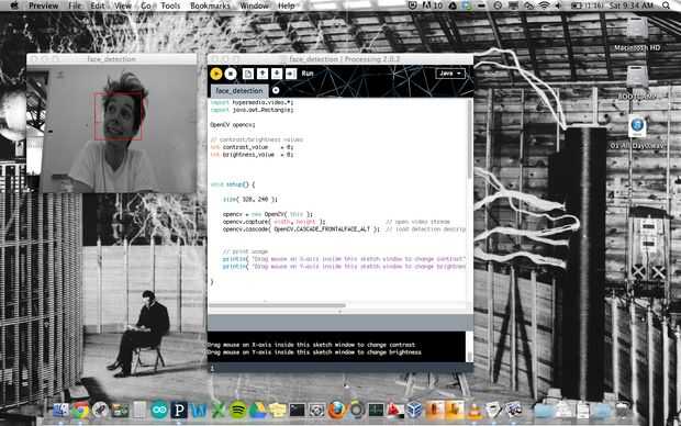 La clave de este proyecto está utilizando las capacidades de detección de cara de OpenCV. Cuando una persona está mirando hacia la cámara, registrará la cara. Este es un ejemplo ya disponible en la biblioteca OpenCV que fue modificada para este proyecto. El bosquejo (jerga de procesamiento para el código) es analizar las bases de un movimiento de personas. Si la cabeza pasa sobre un lugar determinado en el marco y hay un cambio en la dirección vertical (comienzo a caer hacia atrás), automáticamente tomará una imagen de la cámara web.