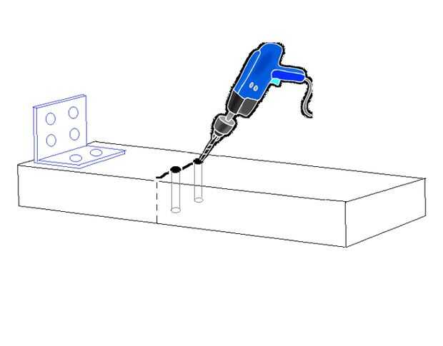 Tomar 1 bloque de madera y dale la vuelta. Hacen una línea frente a la línea que trazaste en el paso 2. Marca 2 puntos en esta línea, como se muestra, perforación entonces 2 agujeros (3/16" diámetro broca) en los puntos, a través de todo el camino.
