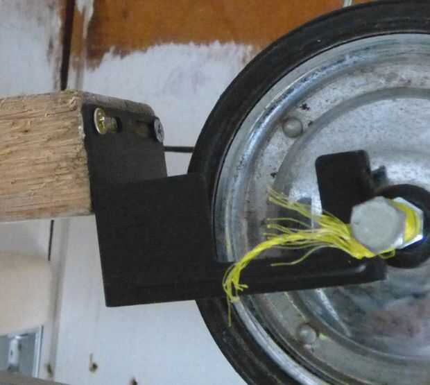 Usted debería poder látigo o correa-cintillo el eje del soporte o soportes por lo que es robusto y la rueda gira libremente. Utilizará esta rueda a tope 3 bloque de madera la hora de la puerta de garaje cerca de él. En un paso posterior, la correa de madera entrará en contacto con el micro no importa donde la puerta termina por detenerse. Por eso es importante la variabilidad de la apertura de la ecuación con este mecanismo de rodillo de la puerta.
